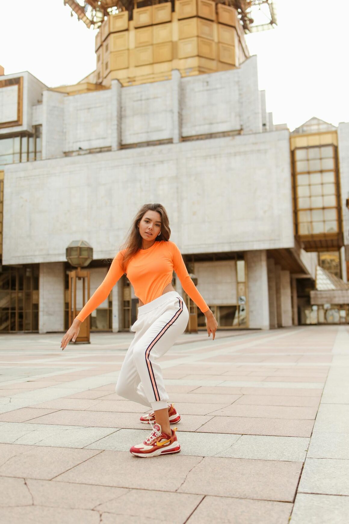 De laatste look laat zien dat Nike ook perfect werkt voor actieve lifestylefotografie. Een feloranje top en witte broek met rode accenten worden versterkt door sneakers die letterlijk matchen met de outfit. De rode Nike Air Max-modellen geven de outfit niet alleen kleur, maar ook energie. Ze stralen beweging uit en benadrukken hoe sneakers een verlengstuk van je persoonlijkheid kunnen zijn.